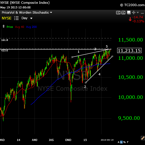 Zooming in to the NYSE with a 30 minute chart (today’s date—May 20) you can see the double top (circled). This happened towards the end of the session, with the release of the Fed minutes suggesting that there would not be an interest raise rise in June of this year. This double top is a test of the final 5th wave top that was the top of the ending diagonal. This should mark the very top of the entire wave. In Elliott Wave Theory, the top of the fifth wave is the end of a trend.