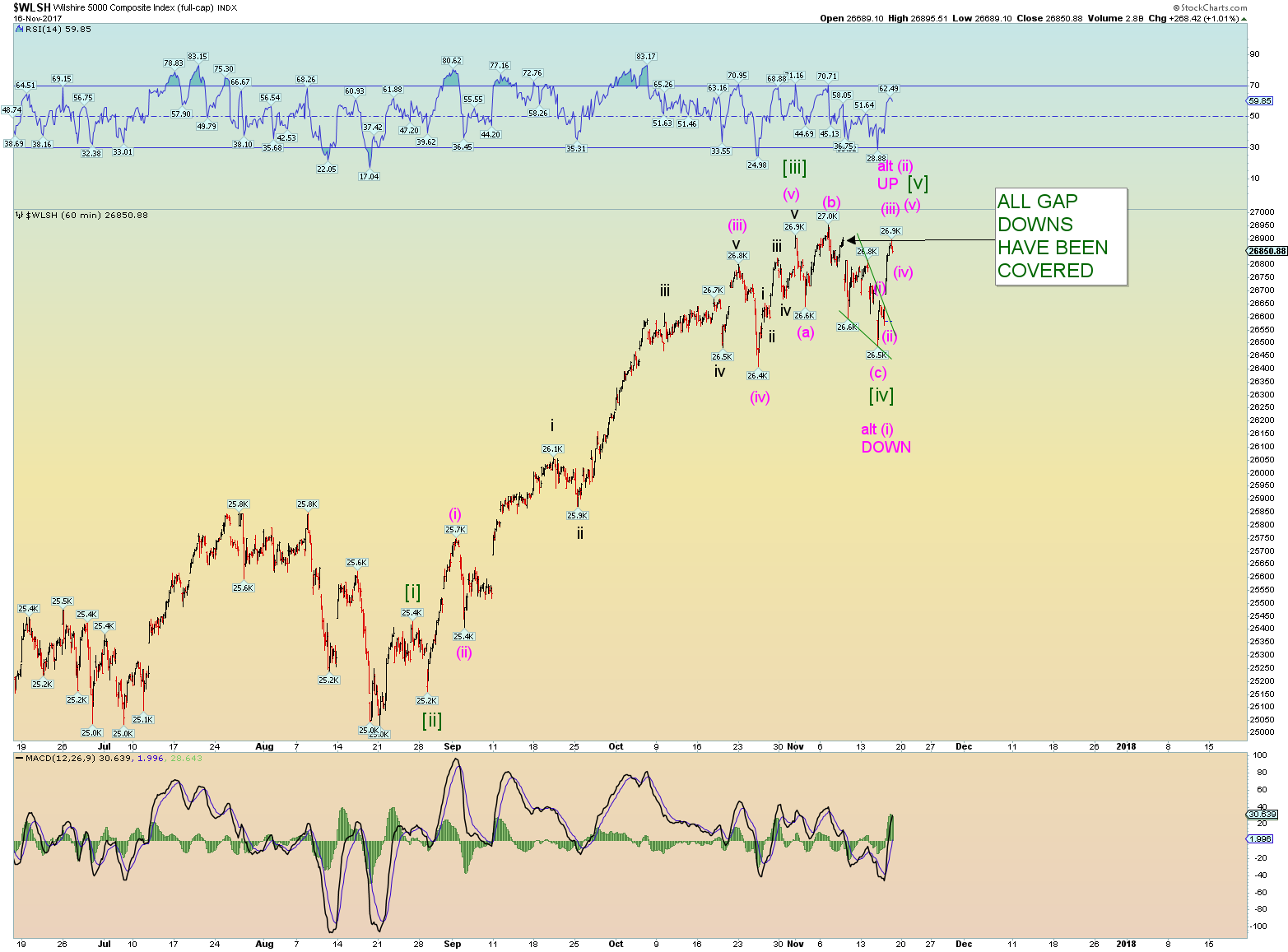 But it’s more than this that keeps the SP500 from not topping until the others top. The next wave down will have to start with five waves—across all US indices. So to get to the point where that can happen, the indices all need a “fresh start”—in other words, a new high.