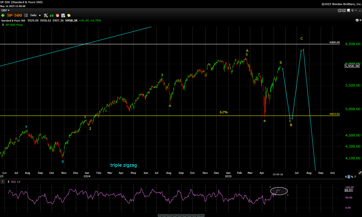 The pattern down from the very top at 6147 is a double zigzag, but expecting one more zigzag to the downside, to the low, which currently is at 4835. This would complete the expected triple zigzag to the downside. The wave structure up from that 4835 low is also a triple zigzag.