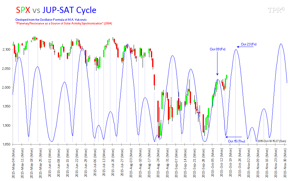 I go back to the last comment from Jaze: The Jupiter – Saturn Cycles has a high this Friday 23rd. So the real downside action could start not before next Monday 26th October well into first week of November. We could well oscillate until this Friday at around 2040 – 2060 and then go down next week.